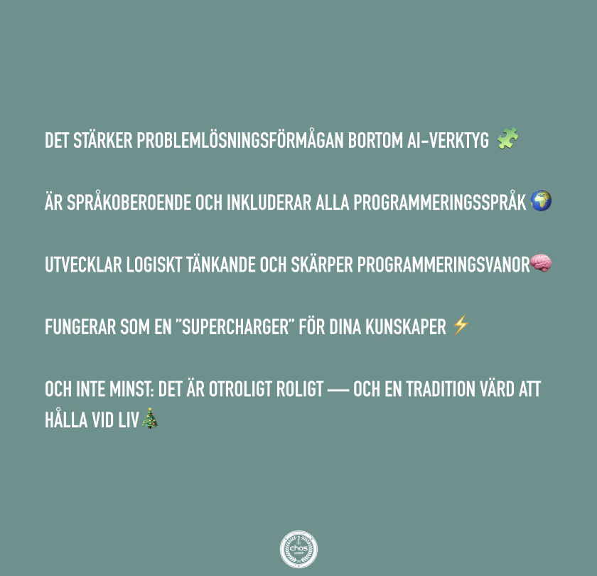 Advent of Code är en uppskattad tradition bland både studerande och utbildare på Chas Academy. Det är ett globalt, känt och prestigefyllt event inom programmering där deltagare från hela världen löser en ny klurig logik- och kodutmaning varje dag fram till julafton.